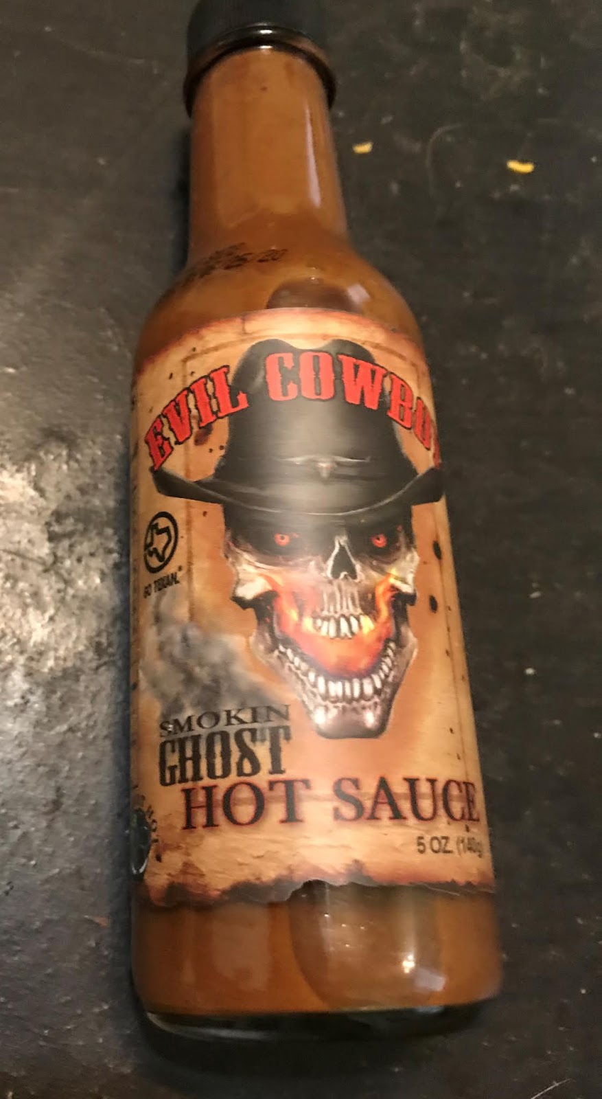 I want to take a look at a sauce I ran across in my online hot sauce explorations. This one is called Smokin Ghost Hot Sauce by Evil Cowboy Hot Sauce. This company is out of Richardson, TX and is a tribute to the sauces the current proprietor's grandfather used to make. They carry their own hot sauces, dipping salsas, and even some queso blanco!